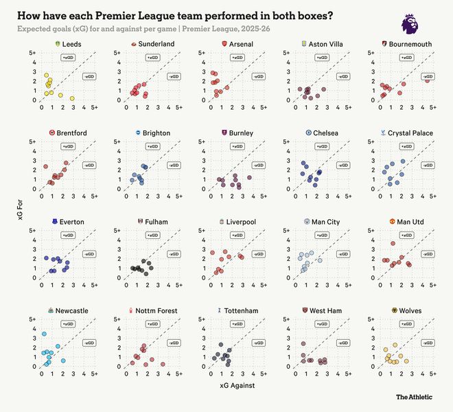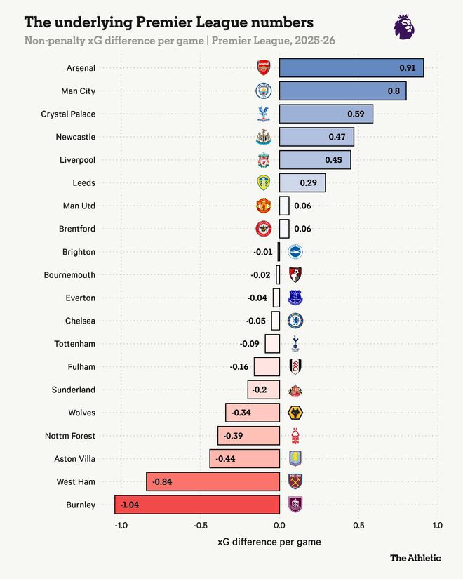 隻有阿森納和紐卡斯爾將對手的非點球預期進球(npxG)限製得比利茲聯更低。在進攻端,利茲聯的npxG排名第11位。遺憾的是,他們在兩個禁區內的表現都不盡如人意。如果他們的表現回歸平均水平,他們將飛速上升。