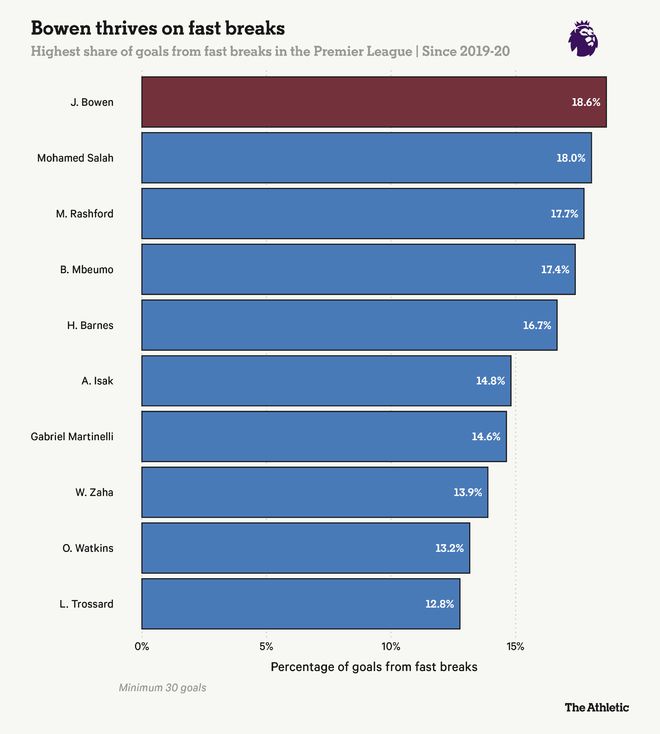再一次,西漢姆聯的希望寄托在他們的護身符鮑恩肩上。這位前鋒打進了球隊本賽季43%的進球,支撐著他們磕磕絆絆的進攻。至少努諾的反擊風格應該能發揮他的優勢——自2019-20賽季以來,沒有球員在快速反擊中進球比例更高。