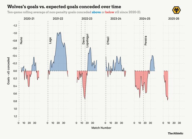 對狼隊來說,唯一的些許鼓勵是他們在九場比賽後的記錄與上賽季完全相同。和那時一樣,狼隊基於他們所麵臨的高質量機會,實際丟球遠遠超過了預期,從11.5的預期失球中丟了19個。他們上賽季成功逆轉了這一趨勢,並需要再次做到這一點以自救。